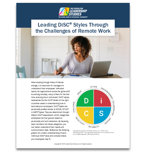 Read this article to learn more!When leading through times of intense change, it is important for managers to understand their employees’ individual needs. As organizations across the globe shift to working remotely, many of them for the first time, learning about individuals’ DiSC® styles can help you better understand their needs and communication style. Download this helpful article for a basic understanding of each individual DiSC® style and consider where your employees may fit! Download Now |