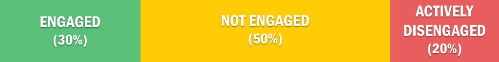 There are three primary levels of employee engagement. These levels are engaged, not engaged, and actively disengaged. Typically, only 30% of the workforce falls into the engaged level.